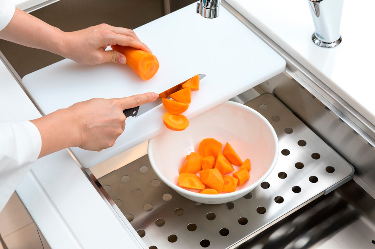 Sự đặc biệt của bồn rửa chén shigeru còn nằm ở hệ thống ray trượt thông minh tích hợp sẵn trong lòng chậu để sử dụng thớt và giá lỗ. Thiết kế này biến khu vực rửa bát thành một trạm sơ chế thực phẩm chuyên nghiệp, giúp tiết kiệm không gian và giữ cho mặt bếp luôn gọn gàng.