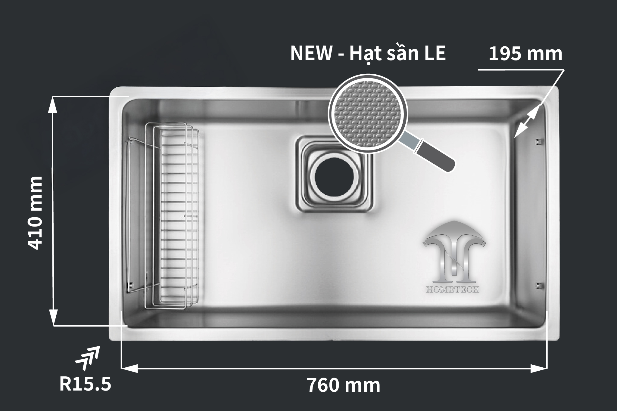 Công nghệ dập nổi hạt (Emboss) là giải pháp tối ưu giúp tăng cường khả năng chống trầy xước bằng cách tạo ra các điểm tiếp xúc nhỏ li ti trên bề mặt chậu. Công nghệ này giúp các vật dụng sắc nhọn như dao, kéo không thể tiếp xúc toàn diện với nền thép, từ đó giữ cho mặt chậu luôn mới.