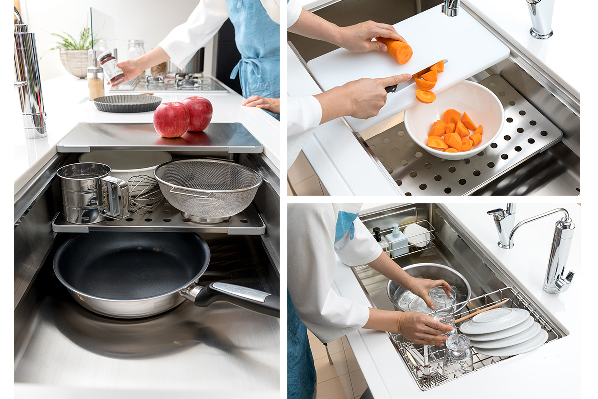 Một điểm cộng lớn là hệ thống phụ kiện đi kèm vô cùng đa dạng, từ thớt nhựa kháng khuẩn, giá để bát đĩa đến giá lỗ thoát nước. Tất cả đều được thiết kế vừa vặn hoàn hảo với lòng chậu, biến khu vực bồn rửa thành một trạm sơ chế thực phẩm đa năng, giúp tiết kiệm không gian bàn bếp đáng kể.